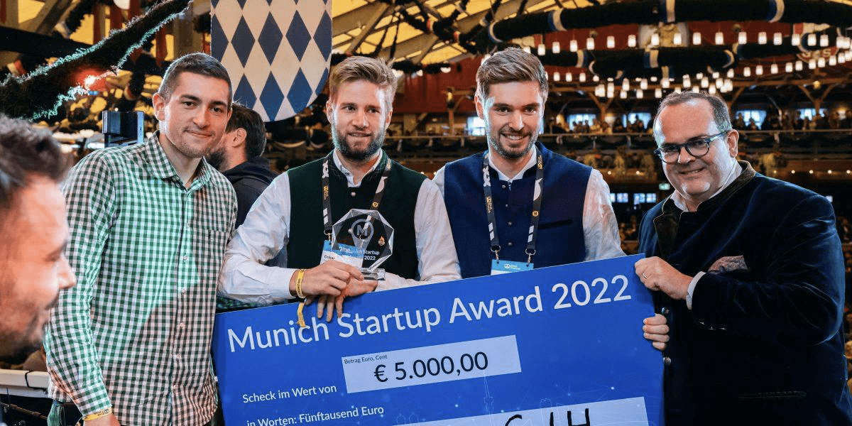 Image 1: The presentation of the Munich Startup Awards 2022: Arno Eggers from Munich Startup, Oskar Gruber and Valentin Plapp from Pixel Robotics together with Economic Officer of the City of Munich and a Wiesn boss Clemens Baumgärtner (Photo: Lukas Lindner / Munich Startup)