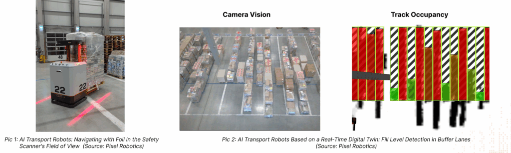 A highlight at this year’s trade show is the Pixel PT’s new foil process. Traditionally, loose foil hanging from pallets that encroach on safety zones triggers emergency stops for the transport robots. Pixel Robotics has resolved this issue: thanks to an innovative process, the Pixel PT recognizes the hanging foil as foil – rather than a safety-critical object (such as a person’s foot) – and continues its movement without compromising safety or efficiency. This advancement significantly boosts productivity and prevents delays in warehouse operations.